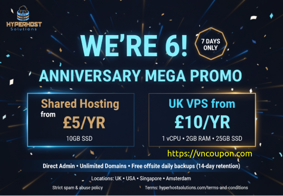 Hyperhost Solutions celebrates its 6-Year Anniversary with a limited-time Mega 优惠信息available for 7 days only. Marking six years of delivering reliable hosting services, server management,、技术支持 to businesses worldwide, this 特价机 campaign introduces some of the most competitive pricing of the year.