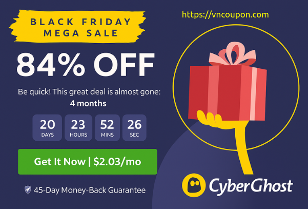 We’re excited to announce CyberGhost VPN’s 黑色星期五、网络星期一节日 2025 offers! This year, CyberGhost is rolling out an incredible deal with 优惠84% the 2-year plan plus 4 months free, giving you powerful online privacy, global content access,、fast, reliable connections at the best price of the year. Don’t miss your chance to secure one of the top VPN services at a massive折扣!