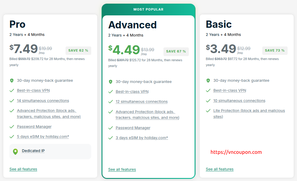 - Advanced (Recommended) – Best value! Includes VPN + Advanced防护, Password Manager, Identity Defender Lite,、more.