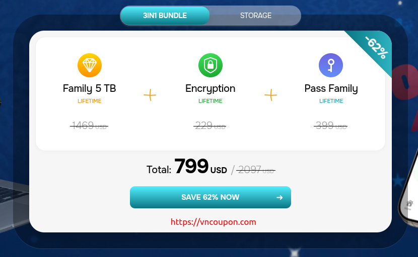 - 3in1 Family Lifetime Bundle (5TB + pCloud Encryption + pCloud Pass Family) – $799 (优惠62%)